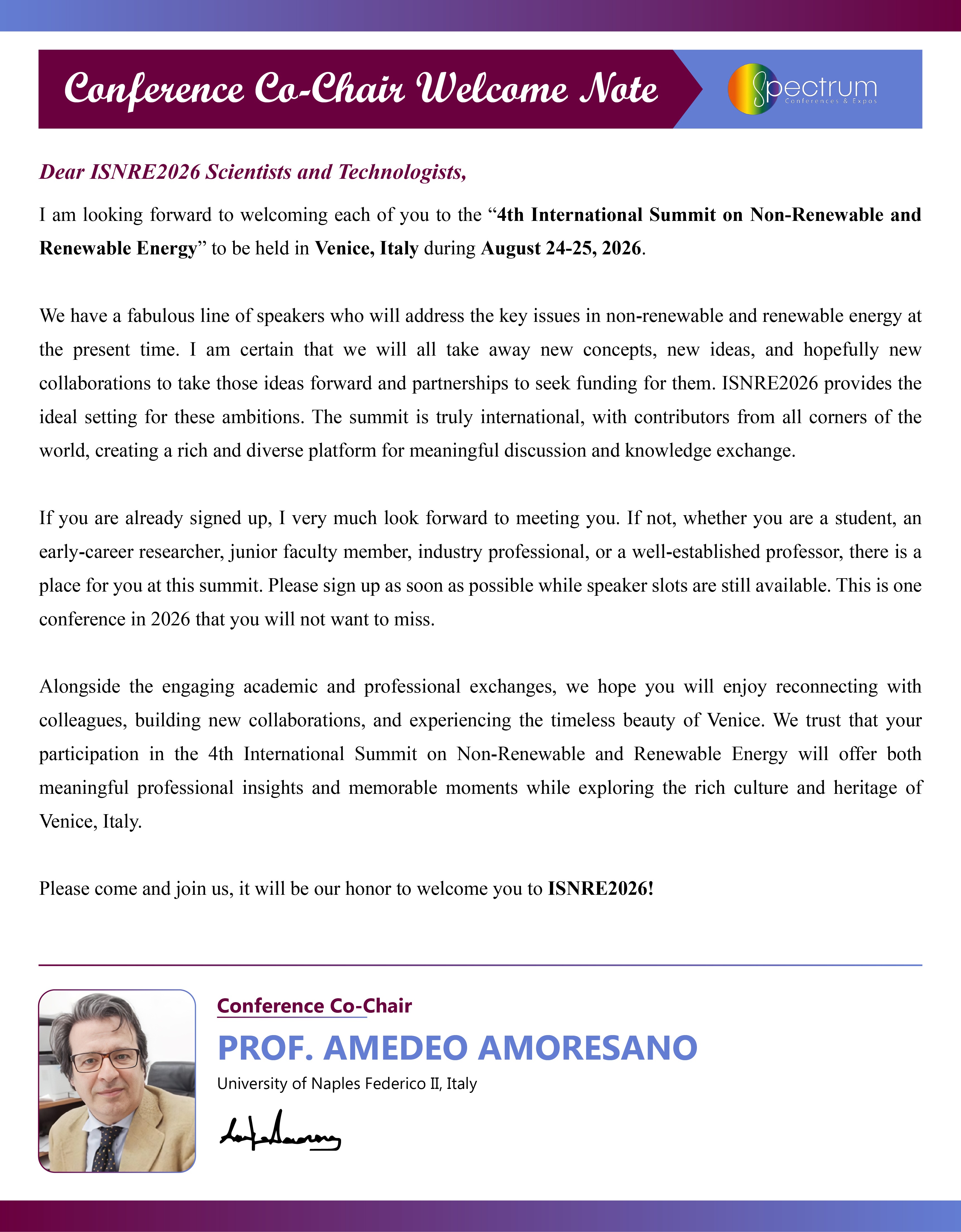 Non-Renewable and Renewable Energy (ISNRE2026), which will be held in Venice, Italy on August 24–25, 2026.